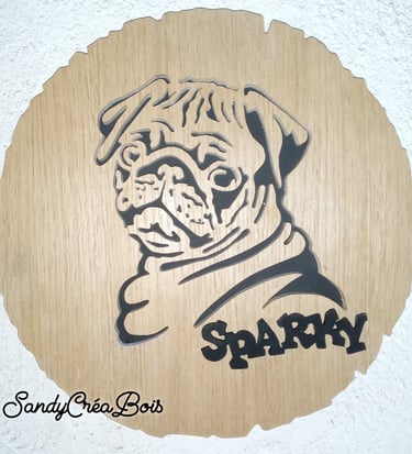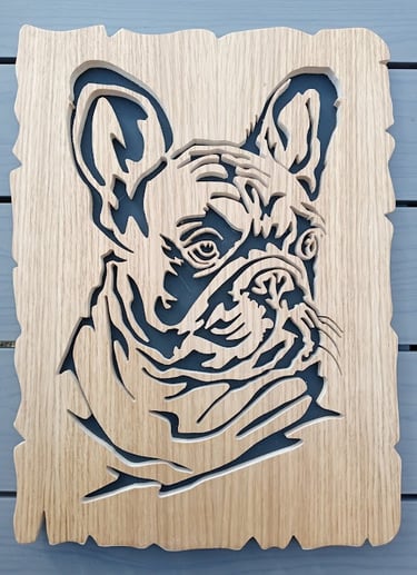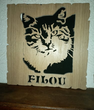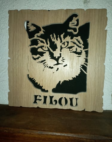 Le portrait est découpé dans du contreplaqué chêne de qualité, puis je colle un fond noir au dos pour faire ressortir l'animal. Je pose une attache cadre. Et j 'ajoute le nom de l'animal. Certaines personnes préfèrent un portrait utile donc je mets plutôt des crochets pour accrocher des clés. Je laisse le choix.